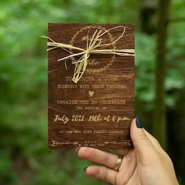 بطاقة دعوة خشبية بنص محفور بشكل قابل للتخصيص للزفاف